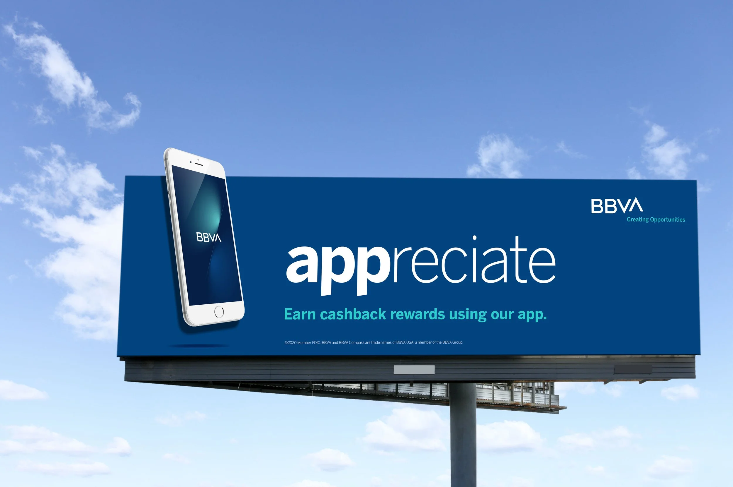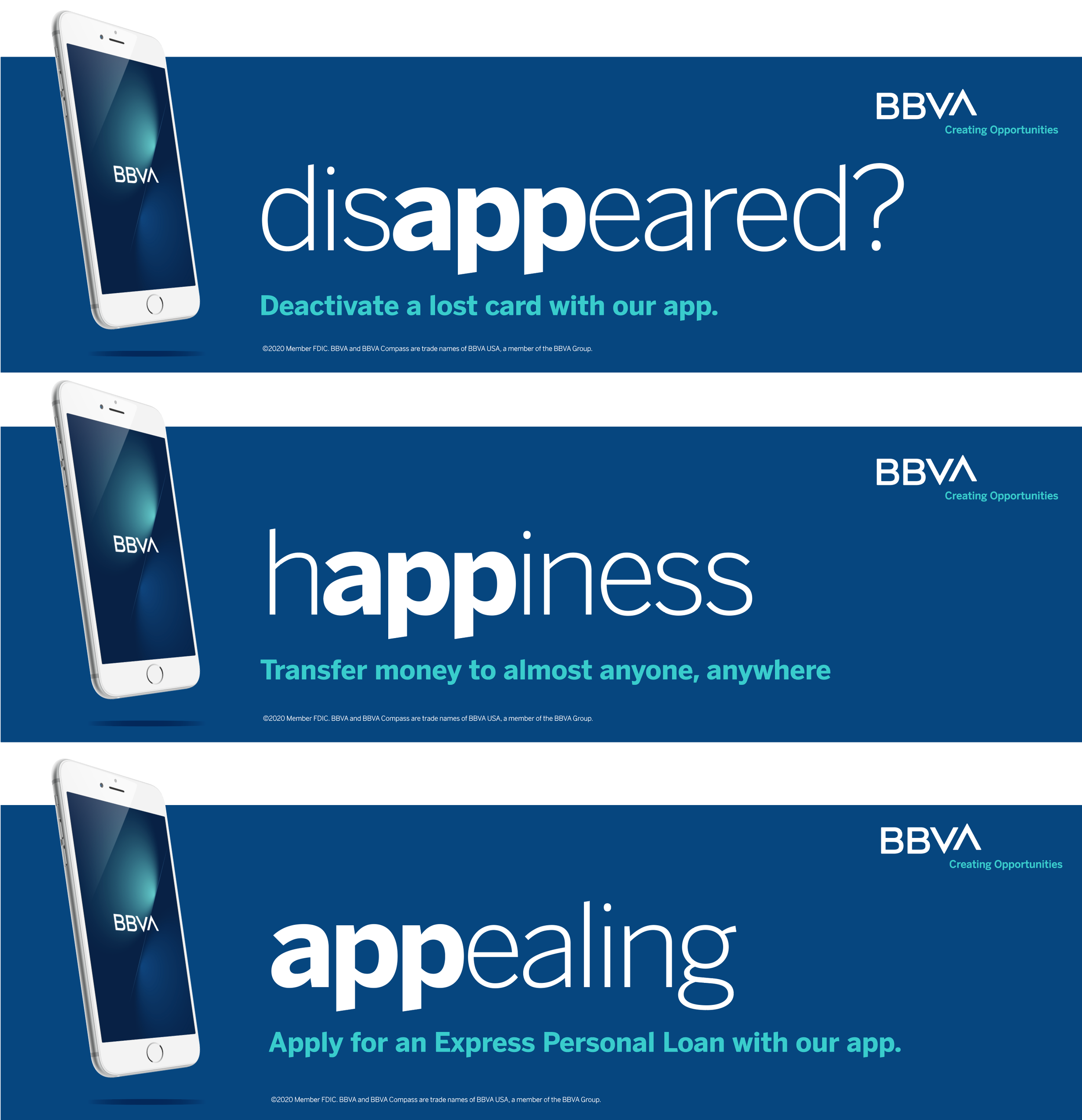 BBVA | MOBILE APP CAMPAIGNVarious in-branch touch points and out of home signage around Birmingham displayed words that were highlighted in a unique way to demonstrate the versatility and convenience of BBVA’s mobile banking app.