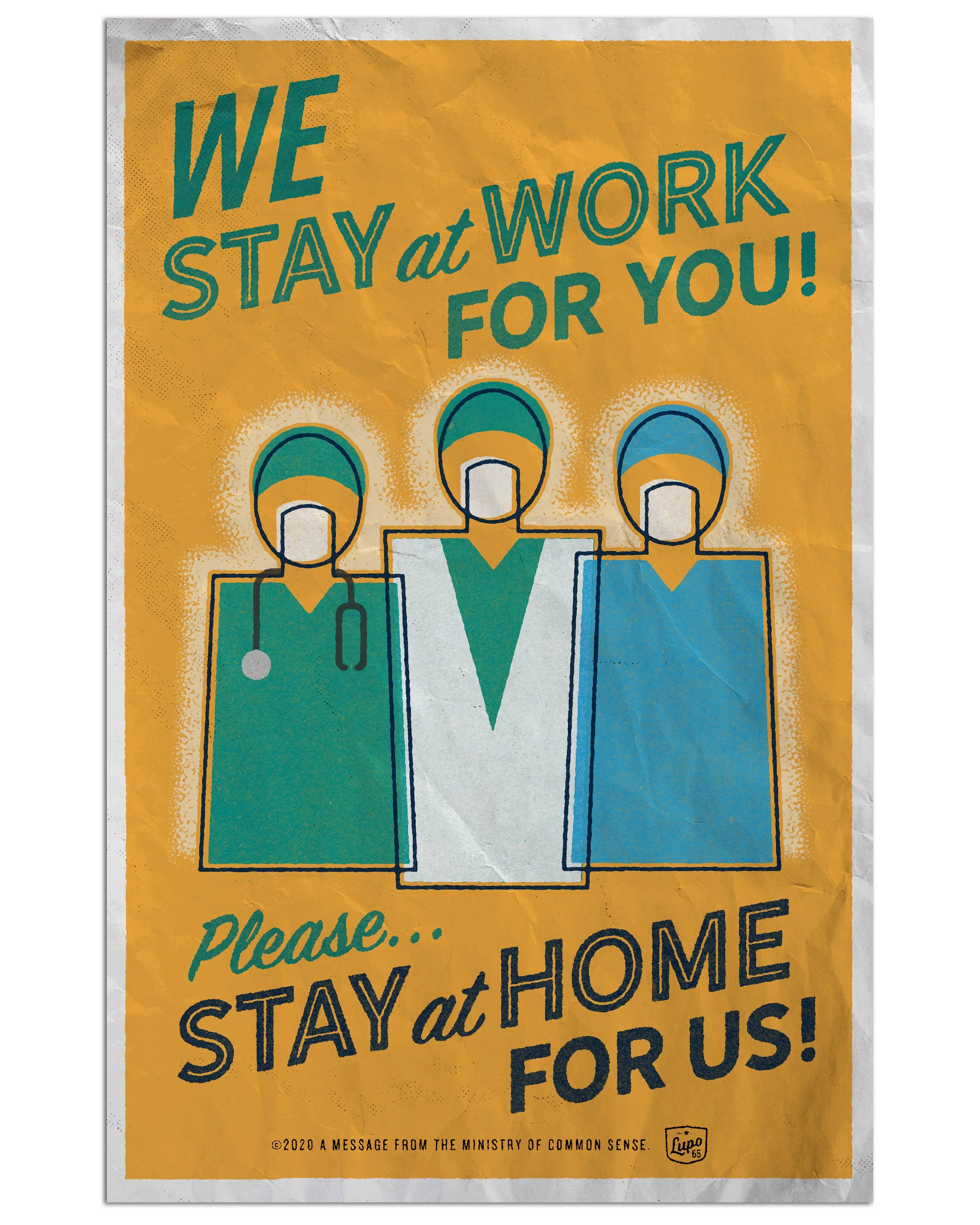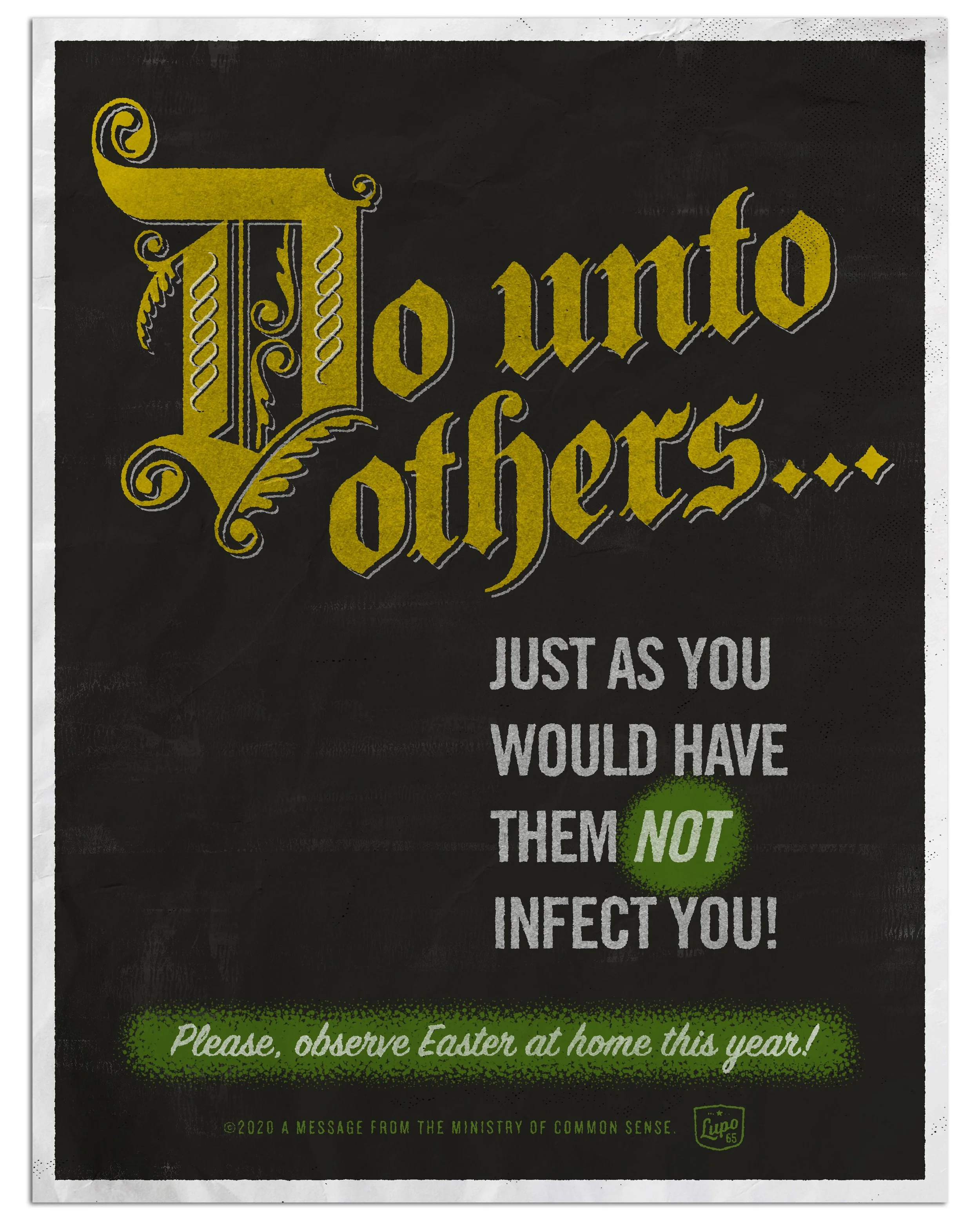 The early days of the 2020 pandemic reshaped daily life and forced us to confront cultural shifts collectively. In response, I created a series of PSA posters inspired by the bold, inexpensive, and fast-produced designs of World War II. Much like those wartime posters—crafted to convey urgent messages about civic responsibility and duty on the home front—this series aims to capture the same spirit: delivering impactful reminders about our shared responsibility during a time of crisis.